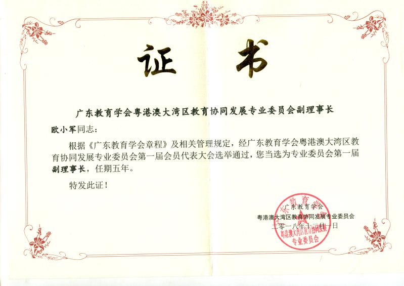 2018年11月30日至12月2日,首届粤港澳大湾区发展与教育创新高端论坛暨广东教育学会粤港澳大湾区教育协同发展专业委员会成立大会在华南师范大学成功举行。经广东教育学会粤港澳大湾区教育协同发展专业委员会第一届代表大会选举通过,我院欧小军教授当选广东教育学会粤港澳大湾区教育协同发展专业委员会副理事长。(供稿:高教研究中心)审核:庄良杰 发布:翟新灵
