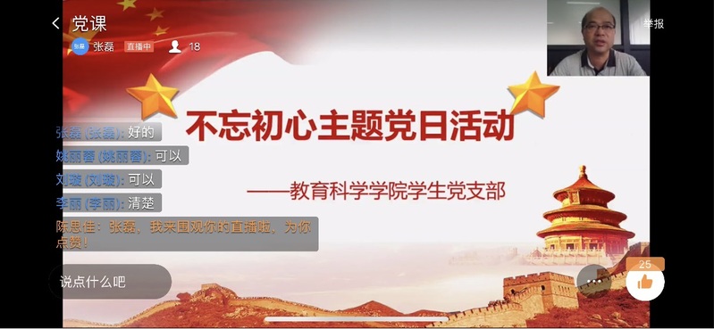 为切实发挥基层党组织战斗堡垒作用和党员先锋模范作用,加强全体党员的责任意识和爱国情怀,教育科学学院学生党支部于4月17日下午3:00通过“钉钉”App在线上召开了不忘初心主题党日活动。学院党总支书记谢伟强、学生党支部书记张磊以及党支部18名学生党员出席本次会议。