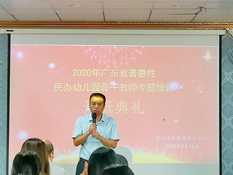 典礼伊始,教育科学学院欧小军院长致辞。首先,欧院长代表惠州学院各级组织单位对各位学员的到来表示热烈欢迎。其次,对新时代学前教育大发展的相关政策、文件做简要解读,并谈到,学前教育是基础教育的基础,要想办好公平而有质量的幼儿教育,重在建设高素质、专业化、创新型的教师队伍。随后向大家介绍了教育科学学院学前教育专业的基本概况,他表示,希望此次培训能为各位学员提供一个学习交流、经验分享、研究探讨的平台,相信随着国家持续加大对学前教育的投入,必将增强每一位教师的获得感、荣誉感、幸福感。