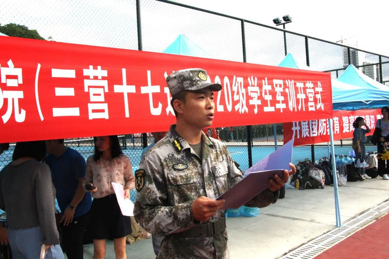 八点整,我院全体参加军训学生在集合地就位,开营仪式由辅导员张磊主持,首先向本院参训学生介绍了参加开营式的领导、老师及教官们。然后进行了仪式第一个环节:书记向十七连连长授旗,将训练新生、磨炼意志的重任托付给连长。2020级新生代表江力带领同学们宣誓,激情澎湃、斗志昂扬的誓言彰显着当代大学生的风采,同学们都表示要在军训中遵守纪律,不怕苦,不怕累,争当优秀标兵。随后由十七连连长进行讲话,为同学们讲述了军训中的注意事项,并明确表示把安全放在第一位,希望同学们能在接下来的训练中全力以赴,发扬吃苦耐劳精神。