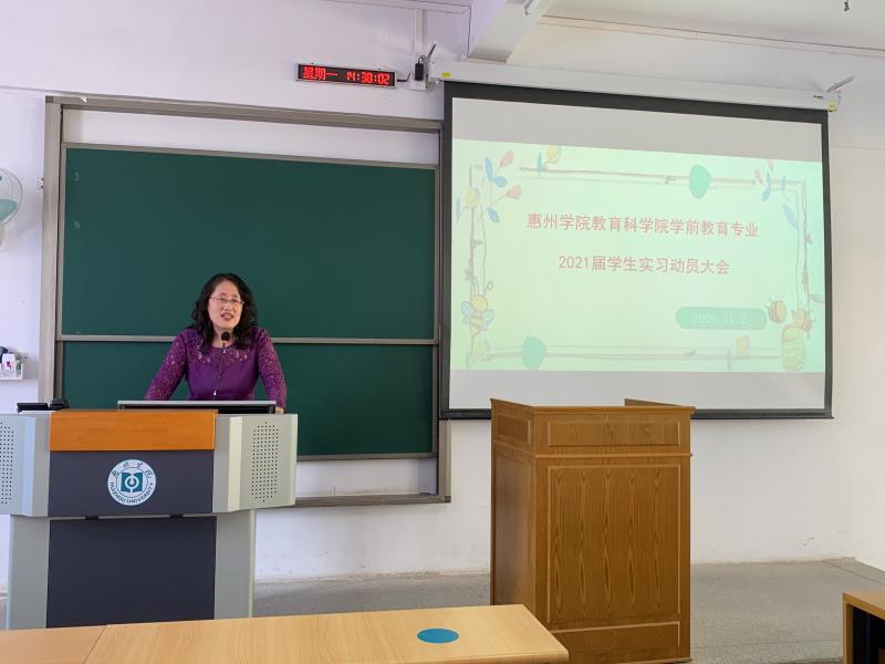第二项议程由黄国庭主任讲解实习具体工作计划。黄主任就实习目的从两方面展开:一方面,实习对于学生自身而言是一次在实践中检验、巩固、提高、丰富所学理论和技能的机会,同学们应当学习、掌握保教能力,为毕业参加工作奠定基础;另一方面,教育实习对于学院而言,有助于维护已有实习基地,保障我院实习工作的后续发展。黄主任接着详细地讲解了本次实习的具体时段、形式以及各实习指导老师的职责,同时他也根据自己对各个幼儿园接纳实习生情况的了解,鼓励同学们好好表现,对在座学生寄予厚望。