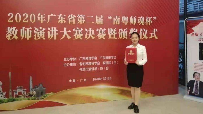 12月13日,广东省第二届“南粤师魂杯”教师演讲大赛决赛暨颁奖仪式在广东演讲学会研学基地举行。我院2019级小学教育专业公费师范生陈铱楦在李咏絮老师的带领下参加了此次比赛,最终荣获大学生组二等奖。