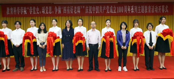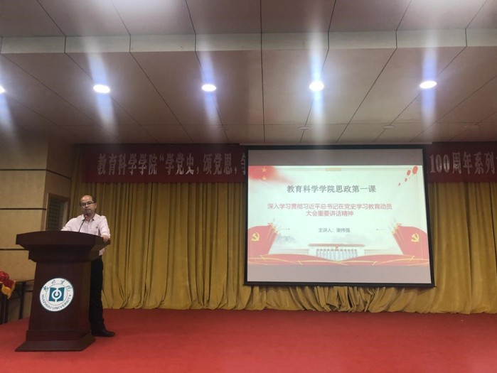 2021年是中国共产党成立100周年,也是“两个一百年”奋斗目标历史交汇的关键节点。为激发广大青年学生的学习动力、凝聚青春力量,同时也为新时代全面建设社会主义现代化国家,实现中华民族伟大复兴的中国梦而不懈奋斗,教育科学学院于3月25日晚在图书馆报告厅开展“学党史,颂党恩,争做‘四有好老师’”庆祝中国共产党成立 100周年系列主题教育活动开幕式暨思政第一课活动。参与讲座的有谢伟强书记、谢桂新副院长、张磊、范红依两位辅导员以及全院学生党员、入党积极分子。