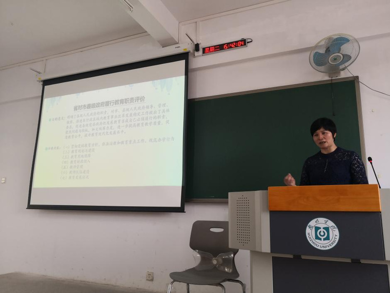 毛少琼副局长在讲座中主要围绕《教育督导与质量评价》课程在惠州市如何实施教育督导与质量监测开展讲座。毛少琼副局长首先介绍了惠州市教育督导发展历程,接着围绕“督政、督学、评估监测”八个字详细阐述惠州市教育督导评价的实施。随后,又分享了惠州教育督导评价的案例,如以“教育强镇”为例督促地方政府依法履行教育职责的督政机制、以“责任督学挂牌督导”为例指导各级各类学校规范办学、提高教育质量的督学体制、以“国家义务教育质量监测”为例介绍科学评价教育教学质量。