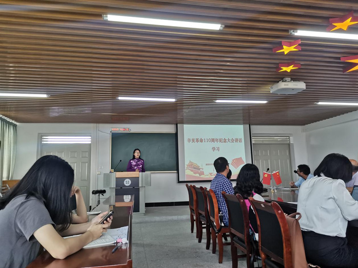 教工党支部书记胡娇副教授为全体党员上了一节党课,领学了习近平总书记在纪念辛亥革命110周年大会上的讲话精神,她结合辛亥革命的历史背景及历史启示,阐明了统一的必要性和必然性。最后,全体党员共同观看了省纪委监委拍摄制作的警示视频。