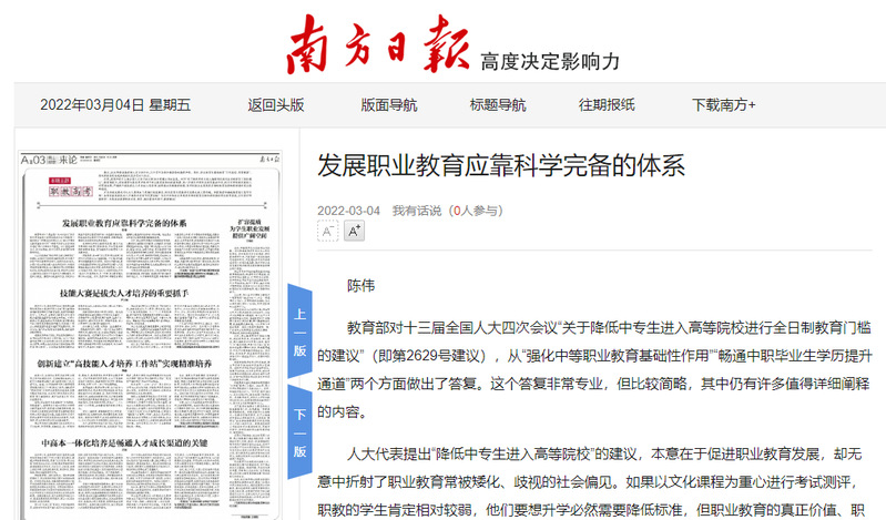 近日,《南方日报》刊登我校陈伟教授的文章《发展职业教育应靠科学完备的体系》。基于教育部对十三届全国人大四次会议“关于降低中专生进入高等院校进行全日制教育门槛的建议”(即第2629号建议)以及“强化中等职业教育基础性作用”“畅通中职毕业生学历提升通道”两个方面答复的思考,陈伟教授提出发展职业教育应靠科学完备的体系的观点,并强调以职教高考为组成部分,建构起全链条、全覆盖、完整的职业教育升学—考试体系,能从根本上撬动职业教育发展困局、激荡职业教育活力、强化职业教育吸引力。
