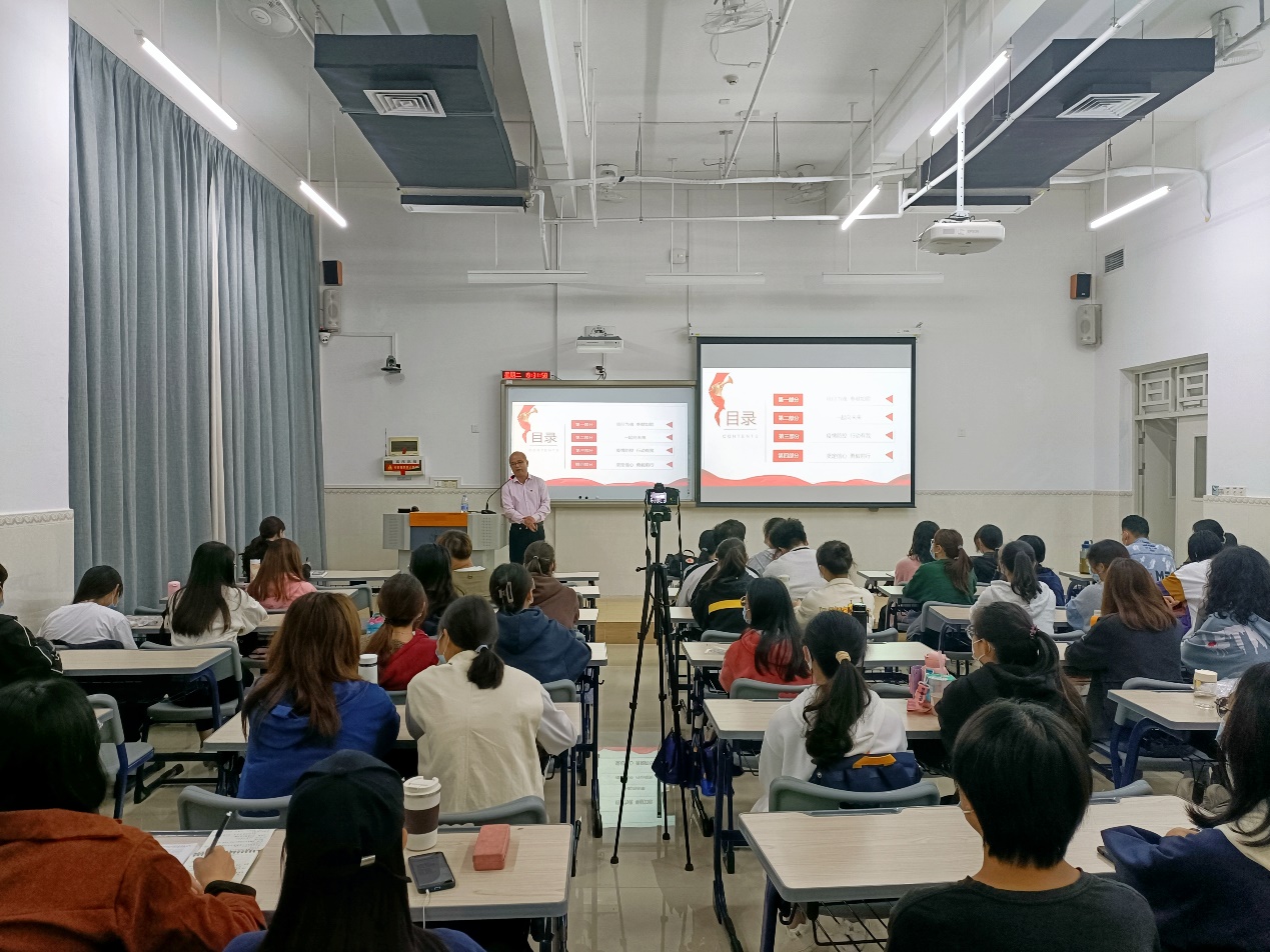 谢伟强主要围绕以下四个方面的内容进行展开:一是“信仰为魂,奉献如歌”,用“全国脱贫攻坚楷模”张桂梅的感人事迹,高度赞扬了她的无私奉献精神,号召全体学生要努力争当新时代“四有”好老师;二是“一起向未来”,为同学们讲述北京冬奥会、冬残奥会带给我们的启示,激发广大青年大学生的爱国热情;三是“疫情防控,行动有我”,针对当下疫情,认真分析研判,在形势依然非常严峻的情况下,坚决贯彻抗击疫情总策略、总方针,并就疫情防控提出“早发现”、“早报告”、“早处置”的工作要求;四是“坚定信心,勇毅前行”,勉励广大青年学生,要牢记总书记在建党100周年庆典上大会上对青年大学生提出的“新时代的中国青年要以实现中华民族伟大复兴为己任,增强做中国人的志气、骨气、底气,不负时代,不负韶华,不负党和人民的殷切期望!”