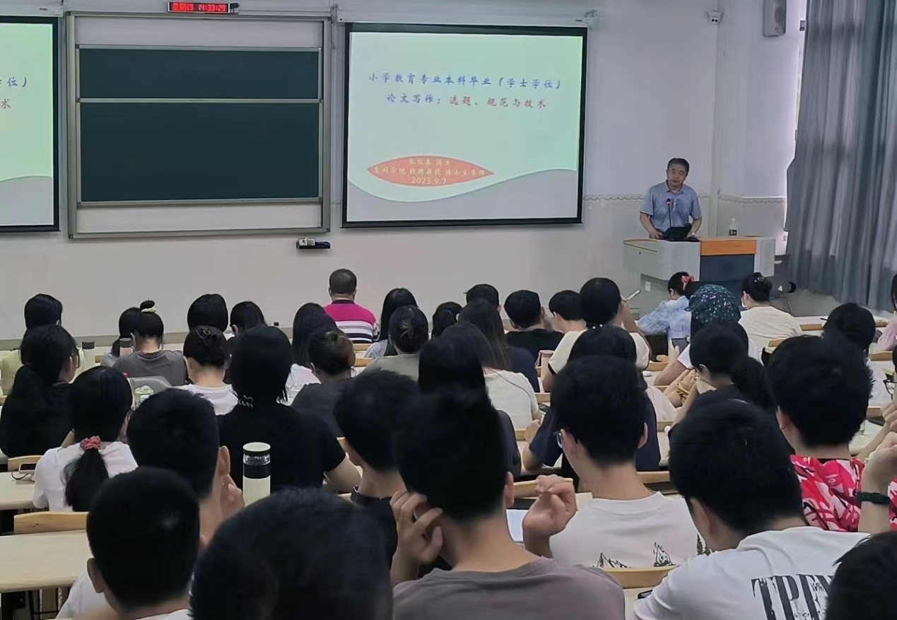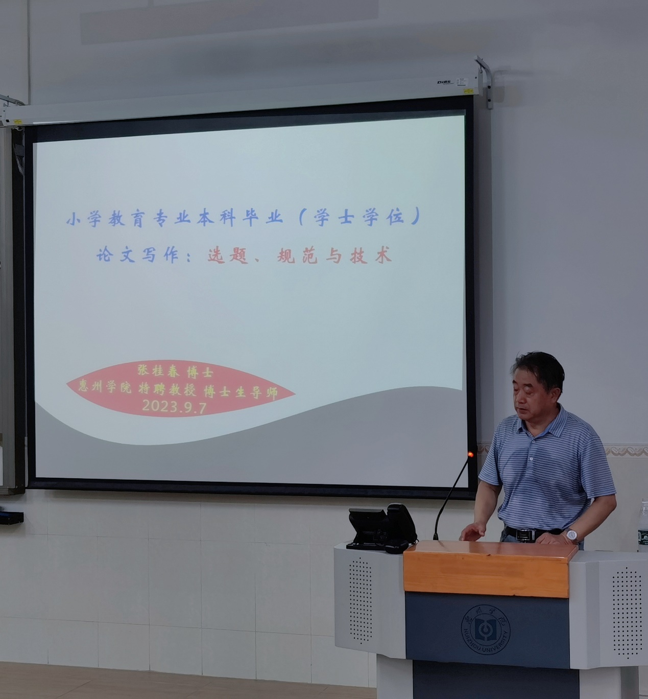 2023年9月7日下午,惠州学院特聘教授、博士生导师张桂春教授在科技楼B座107教室以“小学教育专业本科毕业(学士学位)论文写作:选题、规范与技术”为题开展讲座,对小学教育专业的2024届毕业生进行毕业论文写作指导,出席讲座的还有肖崇好副院长及学院部分教师。