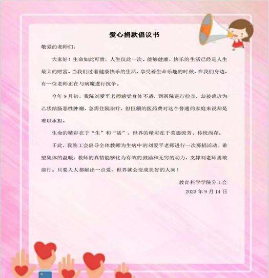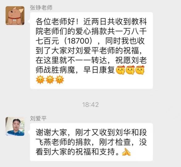 生命的精彩在于“生”和“活”,世界的精彩在于美德流芳、传统尚存。比起捐款,更希望教育科学学院这个温暖的集体能带给刘爱平老师力量,让刘老师感受到集体对他的支持,教育科学学院全体教职工祝愿刘爱平老师战胜病魔,早日康复!