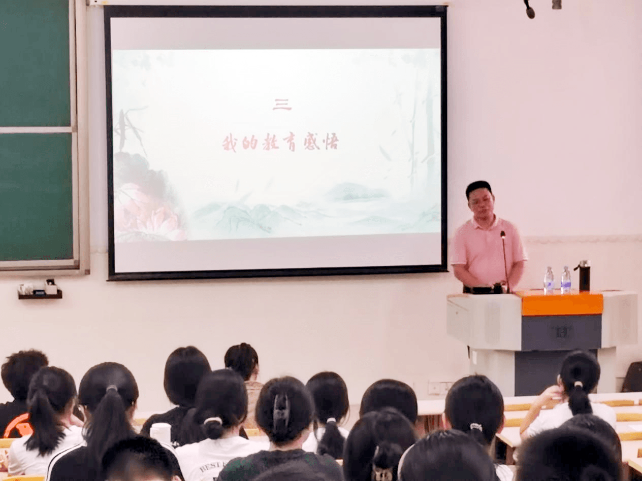 惠州学院兼职副教授练伟东以《躬耕教育绿地,走进幸福人生》为题,从自我介绍、我的教育故事、我的教育感悟三个方面来讲述他的幸福人生。练老师着重讲了在他长达33年教育生涯中的教育感悟,以“教育不是牺牲、而是享受,教育不是重复、而是创造;“善良没有智慧,人生又苦又累”;“善良又有智慧”三句人生信条来启迪新生以后可以在享受教育中创造美好人生。所谓“道阻且长”,他把他的教育阶段分为四个阶段,且每个阶段都躬耕教坛,过得有滋有味。他对新生抱有殷切希望,希望新生能够在他的经验中有所启发,认真学习好专业知识,规划好大学四年的生活,为成为一名教育工作者打下坚实基础。