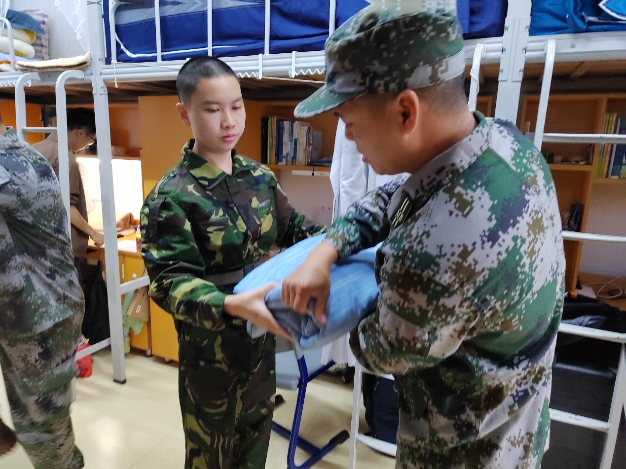 各排的教官来到学生宿舍开展内务整理工作并进行检查。首先由连长组织各楼层学生集合,教官在宿舍走廊处向学生讲解内务整理规定,包括阳台水桶把手需朝外、书本需从左至右依次从高到低摆放、折叠的被子开口需朝向门口等。随后由各宿舍的宿舍长安排本宿舍整理任务,学生们在在学习过程中积极向教官提问,用心学习每一个细节,以严格规范个人内务。