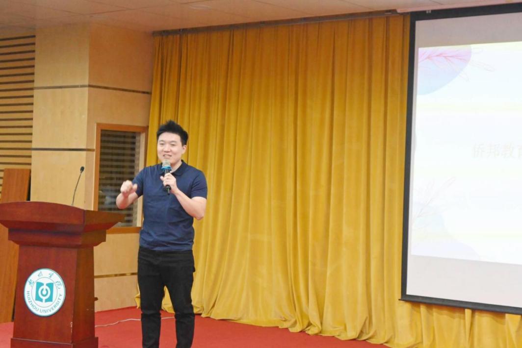 紧接着,惠州侨邦出国教育创始人叶伟聪老师发言,以其10年的留学生活、经历,鼓励同学们突破舒适区,多去尝试多样化、成熟化的求学选择,在进行未来规划时将个人选择和时代背景相结合,从国际化的交流和学习中感悟个人命运和国家命运的紧密相连。