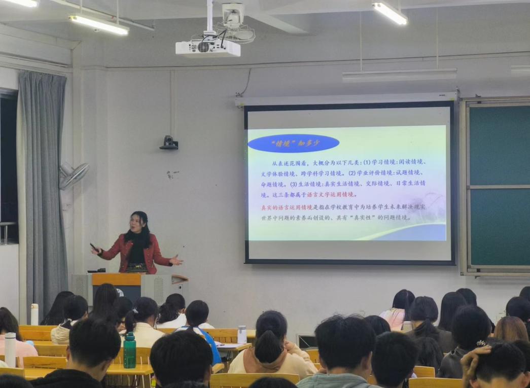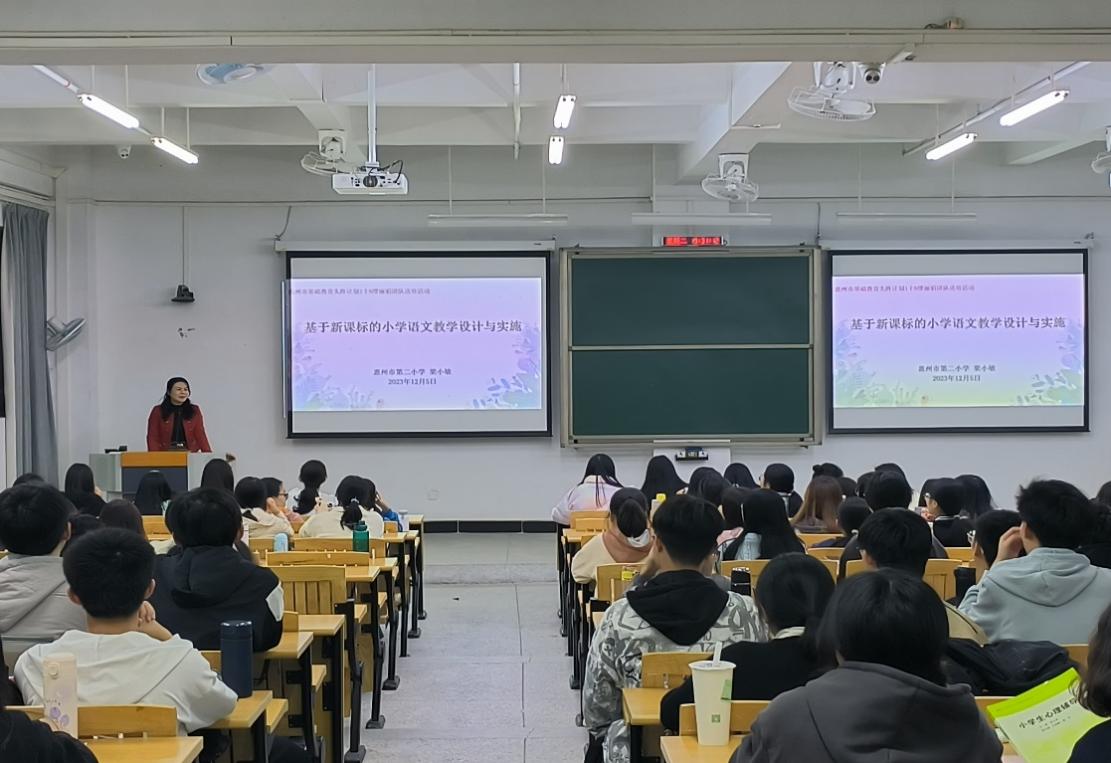2023年12月5日晚,惠州市优秀教育科研工作者、惠州市优秀班主任、惠州市第二小学校长梁小敏在旭日楼107教室开展了“基于新课标的小学语文教学设计与实施”专题讲座。讲座由小学教育系主任金艳主持,惠州市第二小学5位青年老师和2022级小学教育专业全体同学参加了讲座。