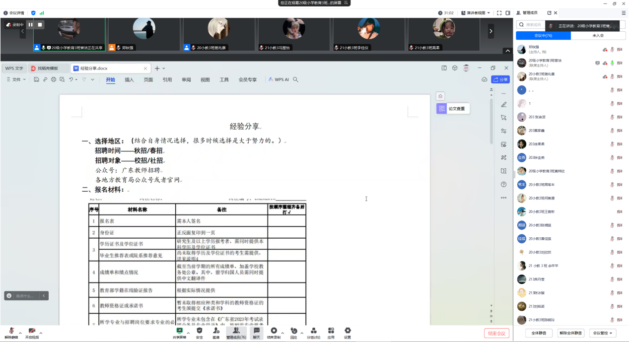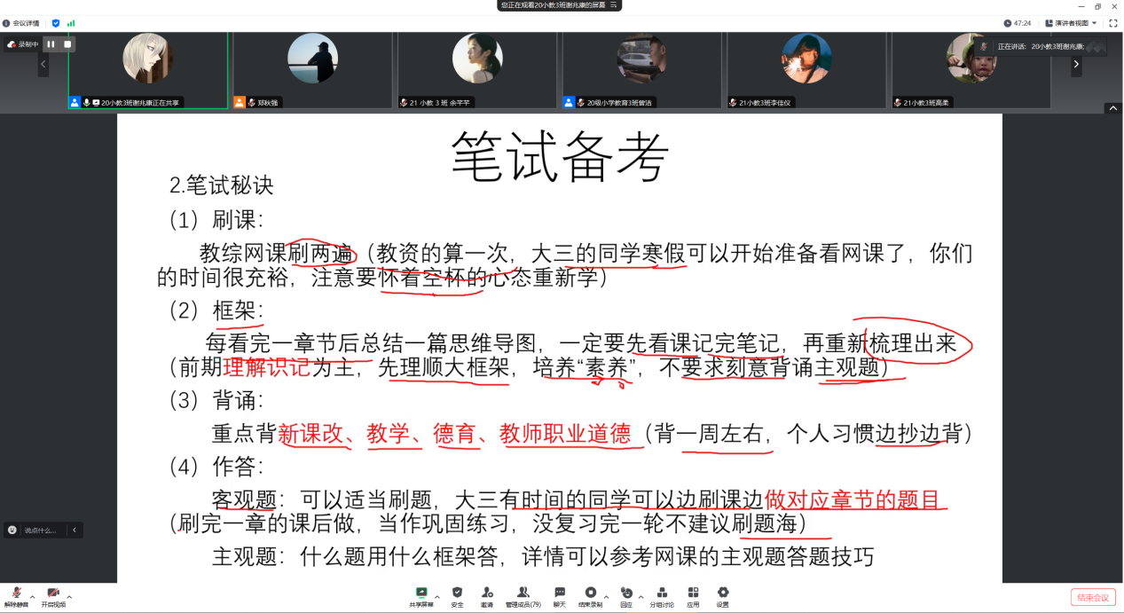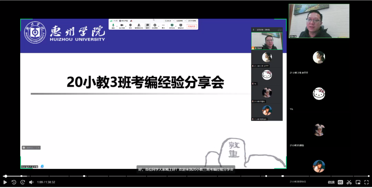 12月12日晚,20级小教3班考编经验分享会于线上腾讯会议平台顺利举行。分享会邀请了20级小教3班成功考取深圳市语文教师编制的曾洁同学、成功考取佛山市数学教师编制的谢兆康同学进行备考经验分享。共有来自20级小教3班、21级小教3班的近80名同学参与了分享会。本次分享会由20级小教3班班主任郑秋强主持。