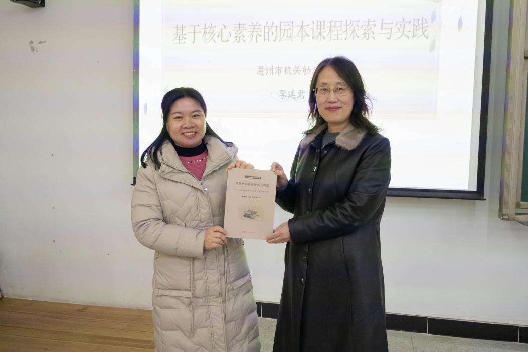 讲座最后,谢桂新副院长将由谢桂新、段飞艳、黄国庭老师共同出版的著作《卓越幼儿园教师成长研究》赠送给李延君园长,以表达她对我校学前教育专业发展的长期支持。本书选择深惠两市10名卓越幼儿园教师进行深度访谈以及实地观察,梳理出影响其成长的关键事件,发现影响其成长的因素,总结出卓越幼儿园教师的成长发展规律。李延君园长也是本书所研究的10名卓越幼儿园教师之一。