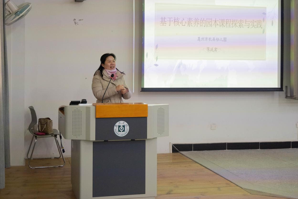 为帮助学生进一步了解园所课程相关知识,2023年12月22日上午,广东省学前教育专家指导委员会委员、惠州市机关幼儿园李延君园长应德赢vwin8868官网之邀,为本院学前教育专业学子开展以“基于核心素养的园本课程探索与实践”为主题的专题讲座。本次讲座由学前教育系黄国庭老师主持,学前教育专业20级研习生、22级学生,及其他感兴趣师生共同参与。