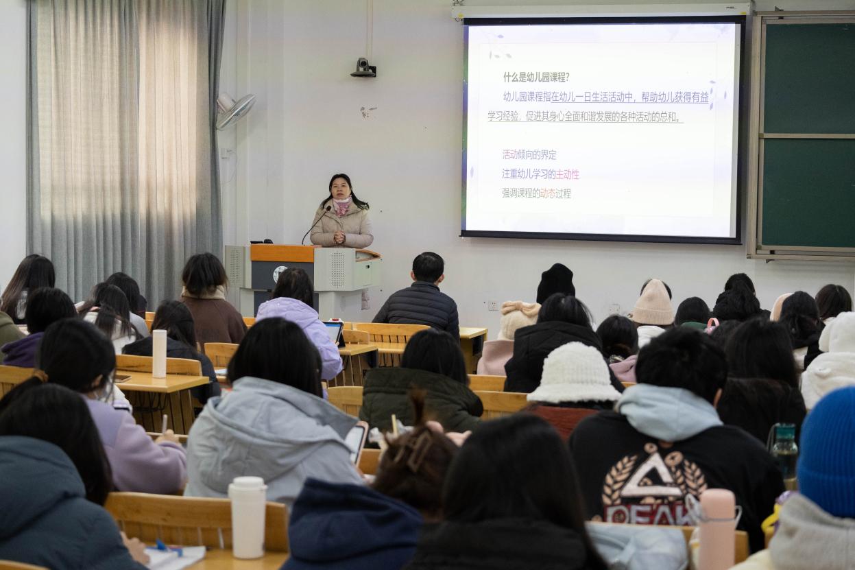 在课程案例分享部分,李园长借助幼儿园中“童趣野炊”的案例,带领同学们展开思考,提出我们要“回到儿童身边,发现儿童视角”。教师应从回归、察觉、体悟和行动四个角度入手,努力做到想儿童所是,见儿童所见,知儿童所思,做儿童所愿。在组织课程活动时,应遵循产生兴趣、初步体验、深度研究、回顾分享、引发思考的五步流程。在另一案例“‘石’在有趣”中,李延君园长则强调教师要明确课程中的三维目标,注重孩子的协调发展,并进行多元融合,开展综合性活动。同学们通过李园长的分享,更为直观地体悟到了园所课程探索与实践的意义,纷纷表示受益匪浅。