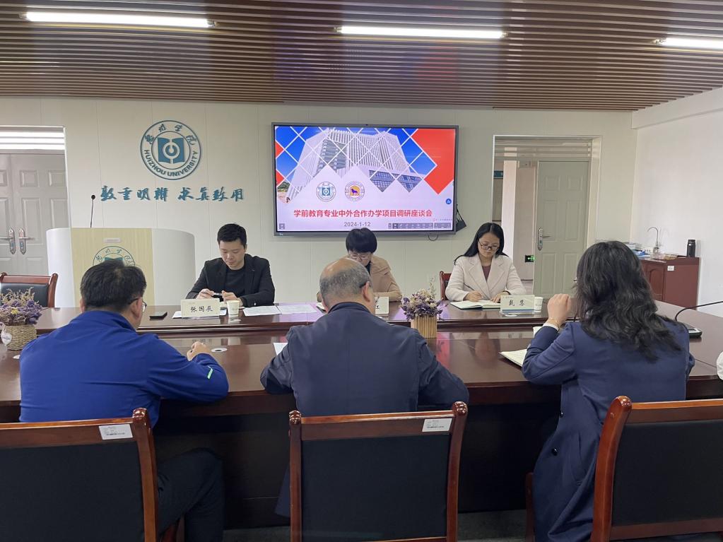 为高效推进惠州学院与美国北阿拉巴马大学学前教育专业中外合作办学项目工作,2024年1月12日上午,国际交流合作处与教育科学学院举办中外合作办学项目座谈会。参加会议的有国际交流合作处林红处长、张国辰科长、戴慧老师,以及教育科学学院党总书记谢伟强、副书记刘华、副院长谢桂新、中外合作办学项目组成员。
