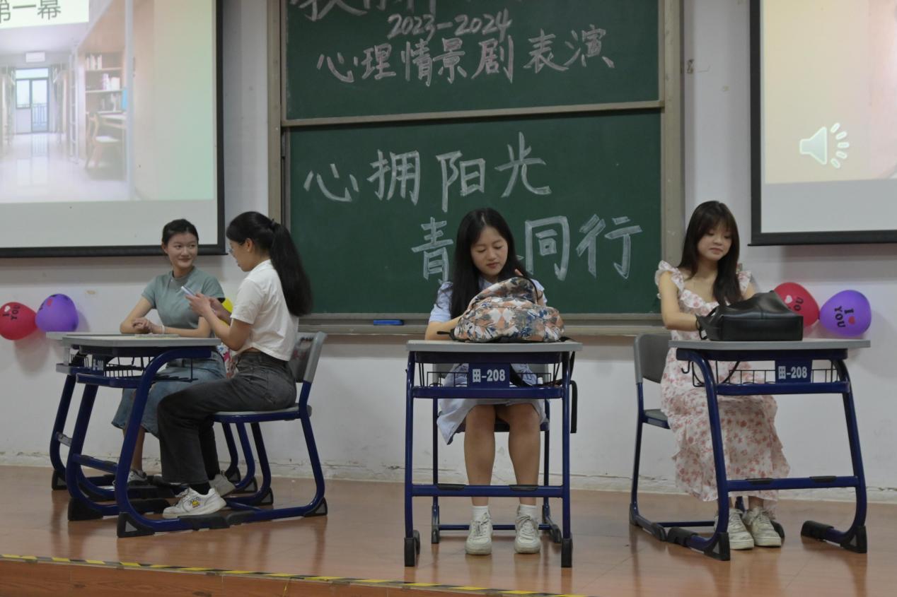 由何瑞琪等同学带来的心理剧《人生没那么多看客》拉开了比赛的序幕。人生,是一部跌宕起伏的戏剧,我们每个人都是其中的主角,但往往有许多人太过在意他人的眼光与评价,最终变得唯唯诺诺、畏手畏脚。在同学们精彩绝伦的表演下,现场观众受益匪浅,懂得了在人生的大舞台上本没有那么多看客关注我们,我们要放下包袱,勇敢做自己的道理。