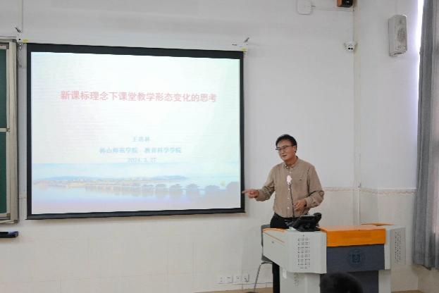 3月29日下午,韩山师范学院党委委员、广东省“百千万工程”小学理科名教师培养项目负责人及首席专家、广东省首届中小学教师培训专家工作室负责人王贵林教授应邀来我院,开展“新课标理念下的课堂教学形态变化的思考”的主题讲座。讲座由王贤文副院长主持,2023级小学教育1、2班全体同学和部分教师参加。