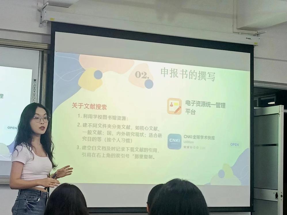 首先,潘雨桐同学从学生的角度出发,强调大创项目对于积累综测、提高论文写作能力、增加考研优势和获得成就感的重要作用。接着,她介绍了大创项目申报的具体流程,从团队、选题的确立,到申报书各个部分的撰写,再到立项后开展研究的相关事宜。随后,进入答疑环节,潘雨桐同学为在场的听众解答疑惑。在现场提问环节中,同学们踊跃发言,潘雨桐同学回答了大家如何设计和分析问卷等诸多问题,同时也分享了她利用三下乡机会做大创调研的经验和收获。