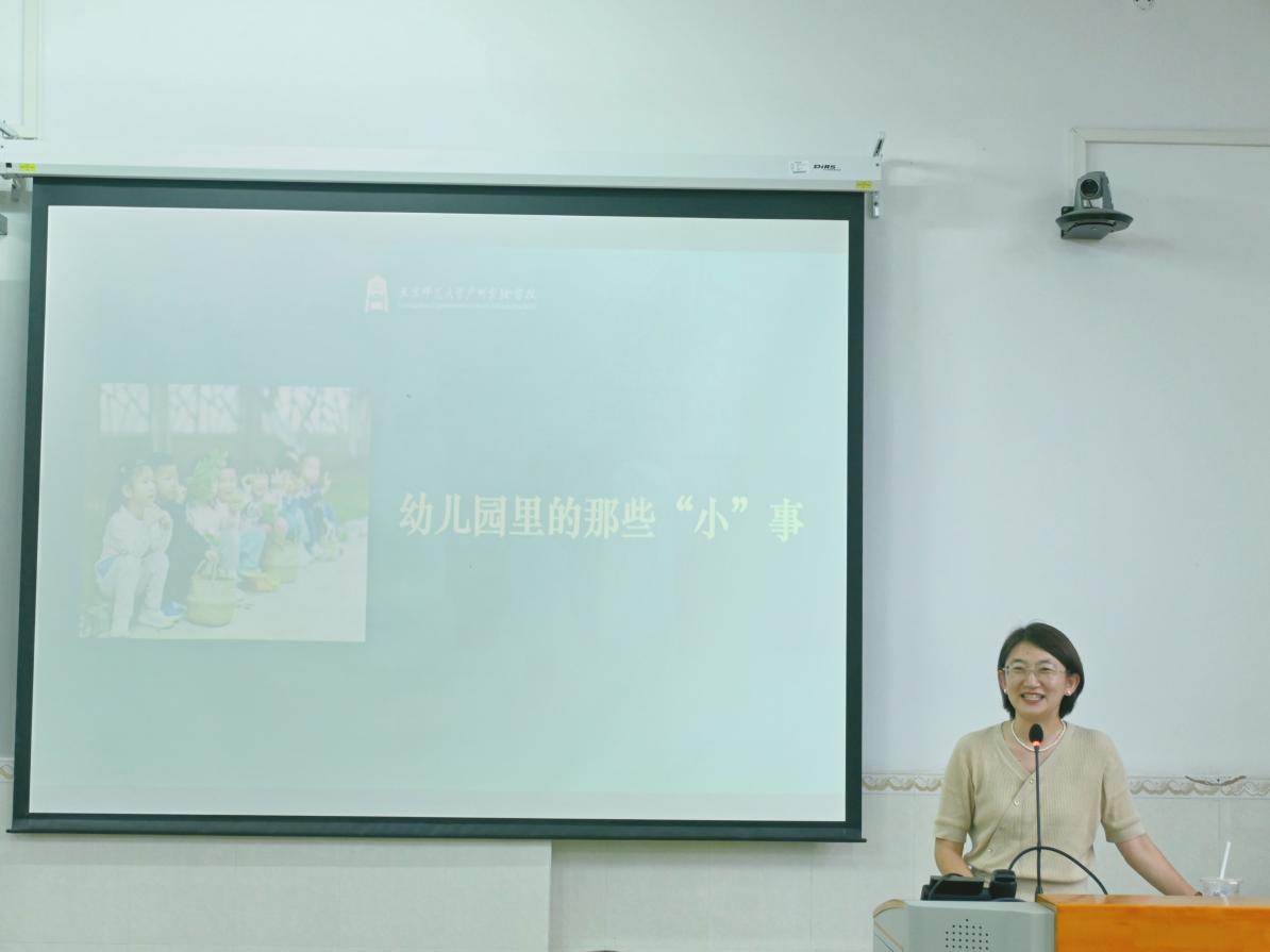 为进一步提高学生对幼儿园教师工作基本内容和职责要求的认识与理解,4月26日下午,幼儿园一级教师、北京师范大学广州实验学校附属幼儿园杨一村园长应德赢vwin8868官网之邀,在科技楼B座308室开展“幼儿园里的那些‘小’事”专题讲座。本次讲座由学前教育系主任黄国庭老师主持,惠州学院附属幼儿园部分教师、教育科学学院学前教育专业21级、22级、23级学生以及其他感兴趣师生参与了此次讲座。