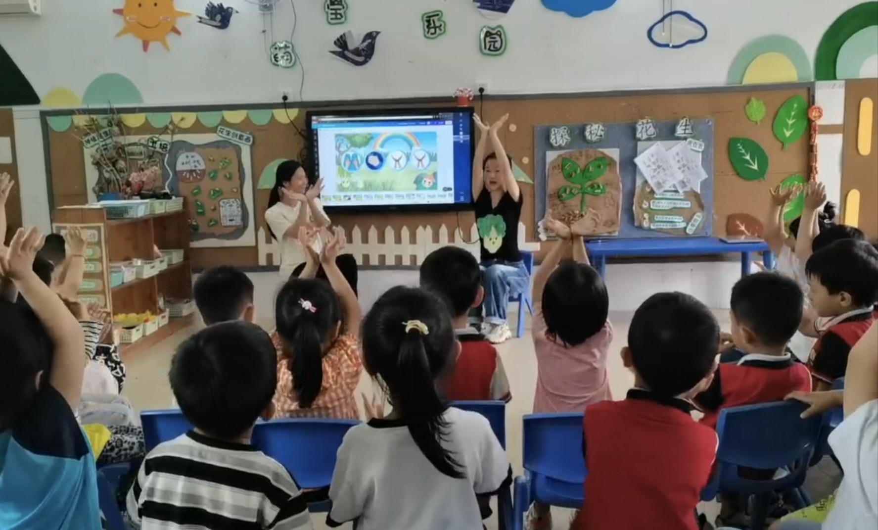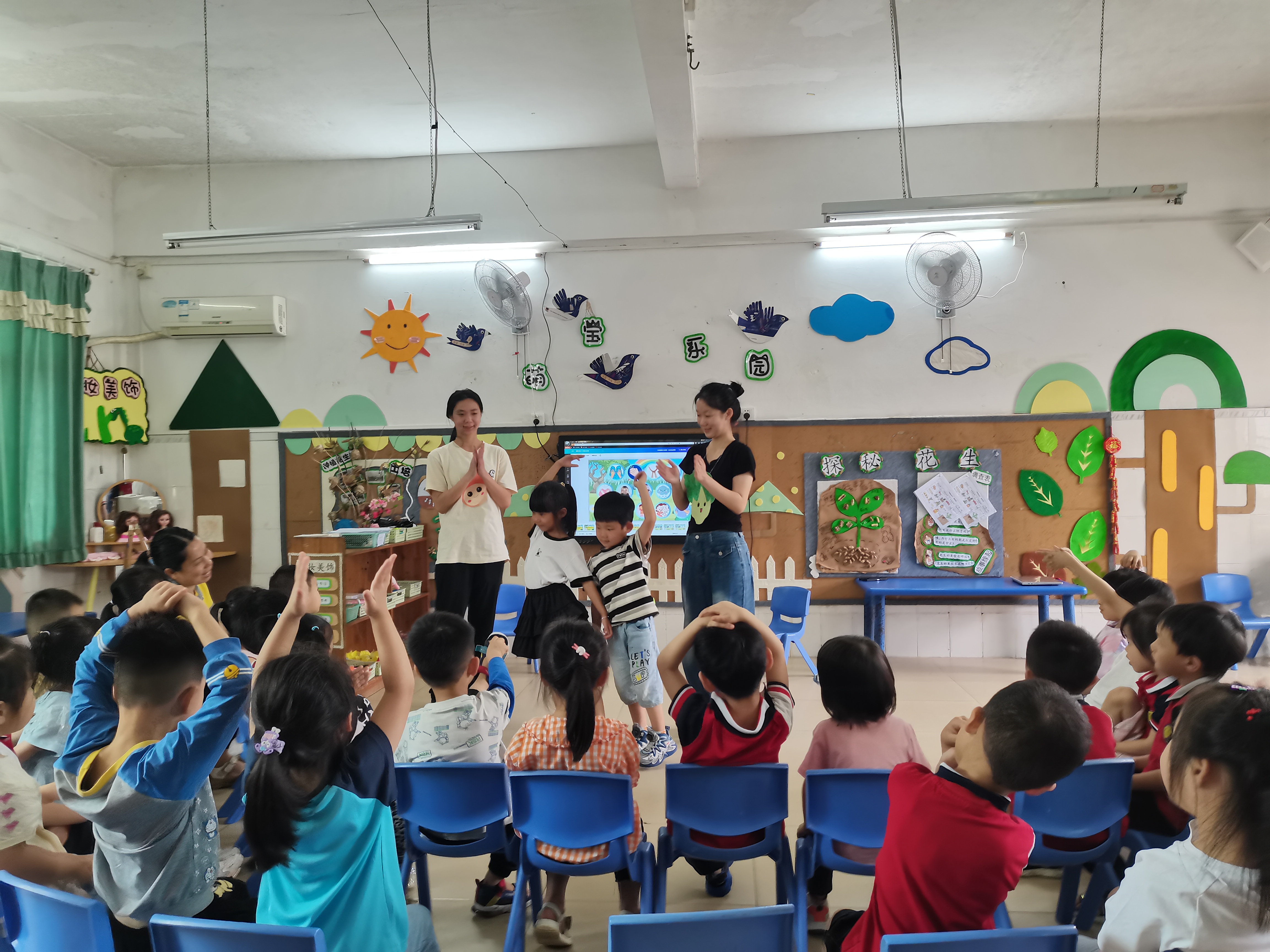 6月6日上午,我们到达三栋镇中心幼儿园,跟随老师来到中二班开展音乐活动《白菜梗和大番薯》。刚站到教室门口,就感受到小朋友们的热情和期待的目光,这也缓解了我们第一次上课的紧张心理。在介绍完各自的名字后,我先让幼儿跟着我们,伸出双手,玩一个课前热身游戏,小朋友们的情绪被快速带动起来。这时候,我就“邀请”出了本次课堂的两位“好朋友”——大白菜和大番薯,小朋友们都激动地喊出了它们的名字。我们先给幼儿讲述了两位好朋友的故事,再通过提问“如果你是大白菜,你会怎么保护大番薯?”来引导幼儿思考,大胆表达自己的想法。最后,我们邀请小朋友们为大白菜和大番薯的友谊故事伴奏,以此开展音乐活动。我们播放了歌曲《白菜梗和大番薯》,带领幼儿学习动作。在活动的过程中,小朋友们都非常积极地学习肢体动作和手势。播放了两遍歌曲后,小朋友们也都能与自己的好朋友进行互动。我们还邀请了几组小朋友上台进行展示,他们都表现得很出色。台下的小朋友也都在跟着音乐舞动身体,可以看出,幼儿们很喜欢这首歌和这种互动方式。