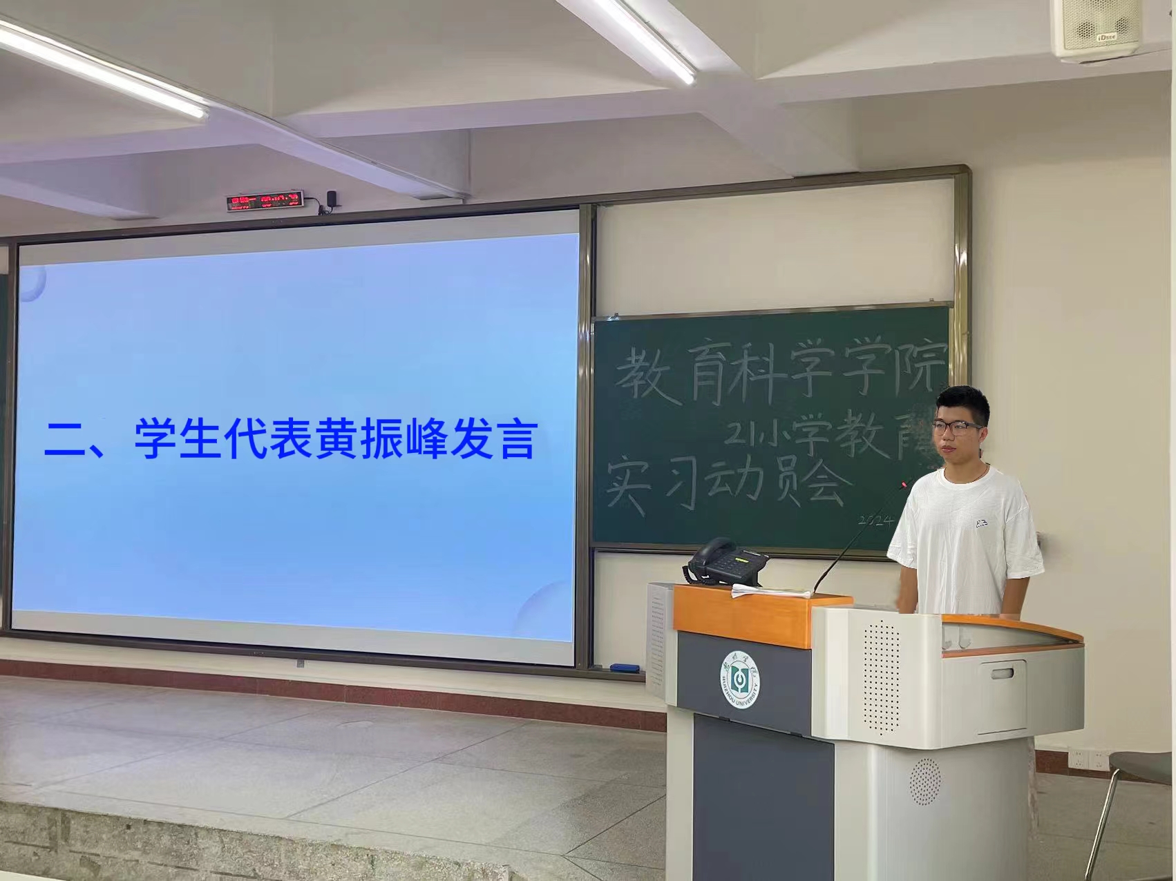 接着,21级小学教育1班黄振峰同学作为学生代表发言,他从实习生的角度讲了实习对每个师范生的重要性,同时希望同学们在实习中抓住机会,注重团队合作以及敢于承担责任,积极投入到实习工作当中。