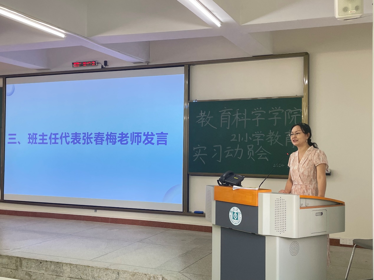 接着,班主任代表张春梅老师在感叹时光飞逝的同时,用充满激情的语言鼓励21级的小教同学们在这次实习中加油努力,为成为一位优秀的教师而不断积累经验,在实习中向教育前辈们虚心学习。