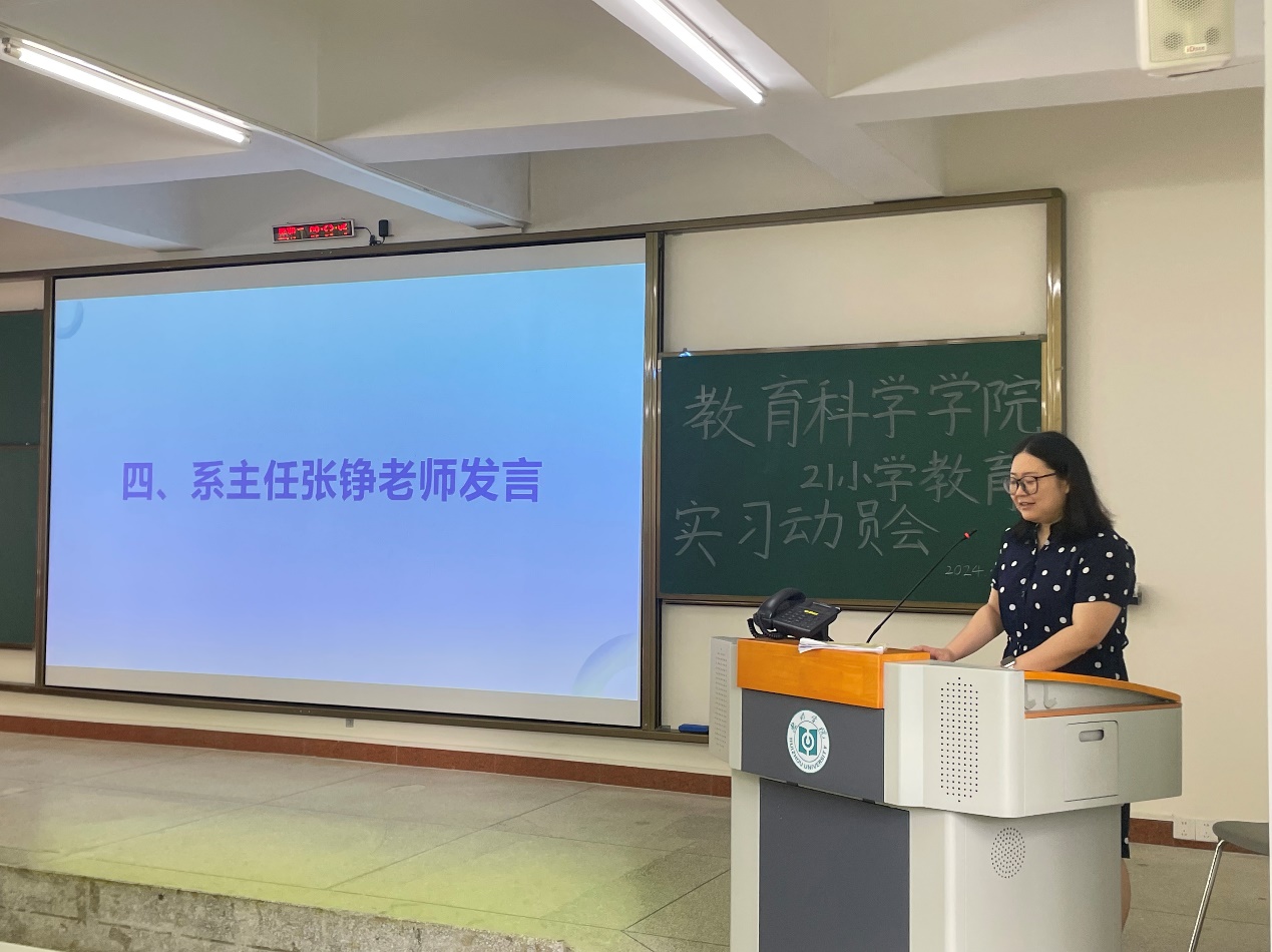 张铮主任重点给21级小教的同学们强调在这次实习中要学有所成,在有限的时间里能够学习到更多教育经验,结合同学们之前所学的理论知识落实到教育实习中。