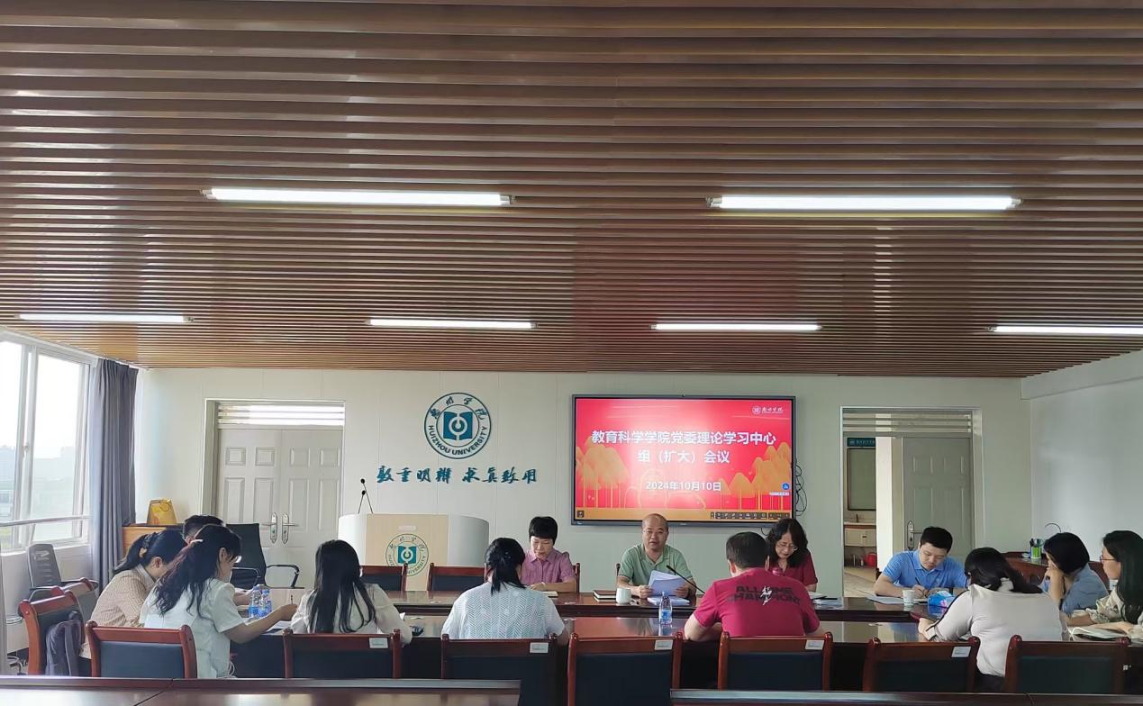 10月10日上午,教育科学学院召开党委理论学习中心组(扩大)学习会议,深入学习贯彻党的二十届三中全会和全国教育大会精神。学院党委委员、各党支部委员参加会议。会议由党委书记谢伟强主持。
