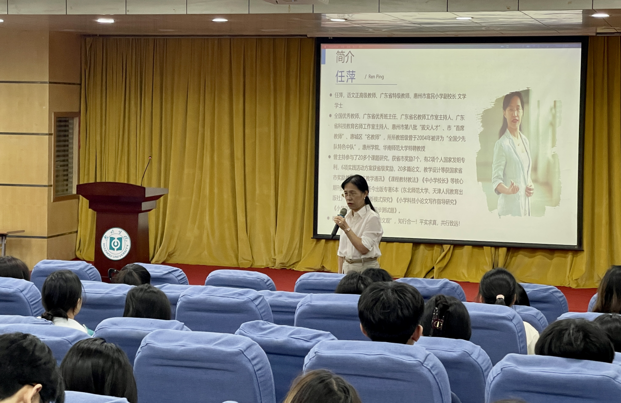 10月31日,全国优秀教师、广东省中小学名师工作室主持人、惠州市富民小学副校长任萍,应邀来我校为教育科学学院小学教育卓越班同学及22级小学教育专业全体学生进行“小学语文单元整体思考及设计”专题讲座。