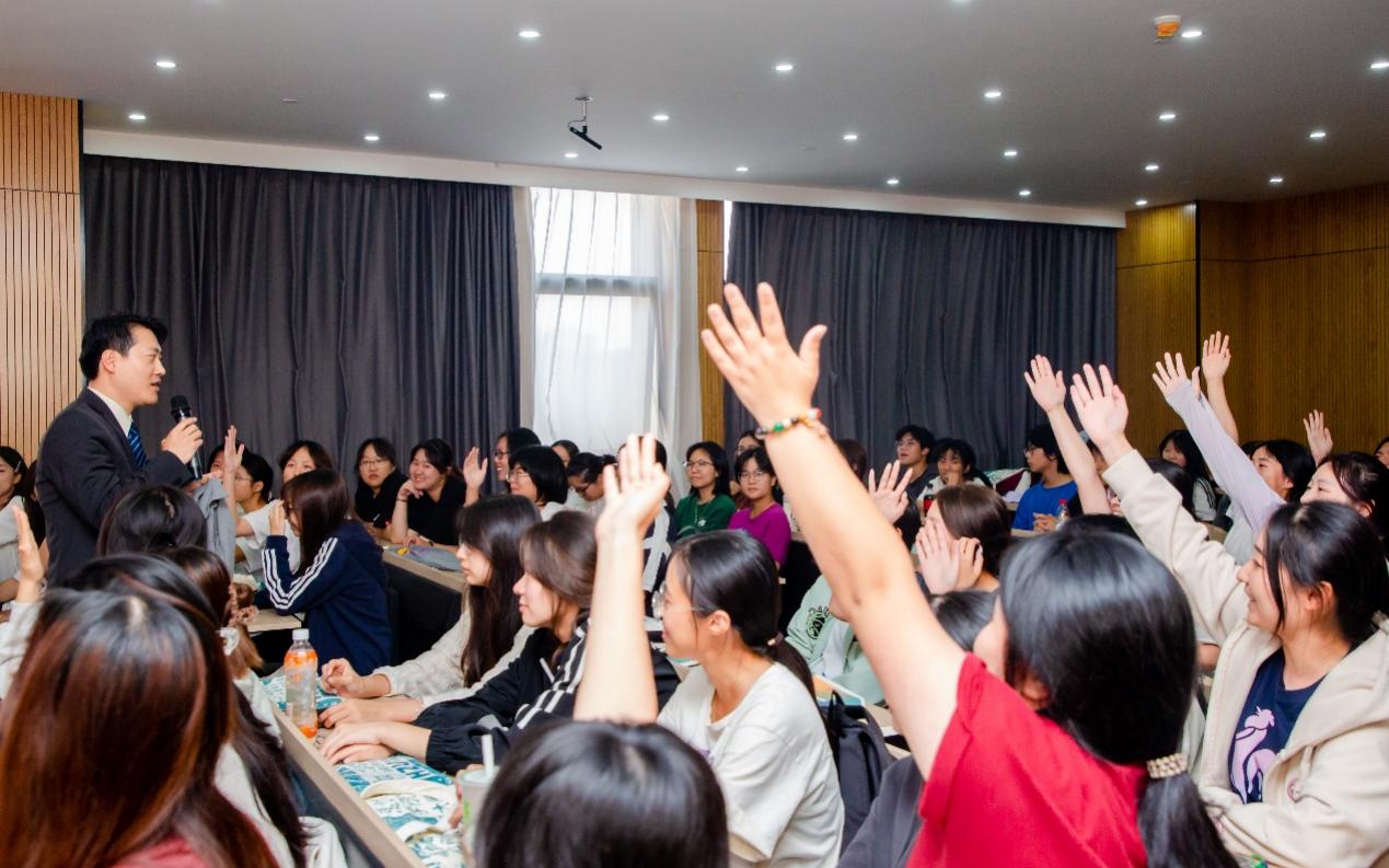 见面会期间,学前教育专业(中外合作办学项目)2024级新生们积极参与、踊跃发言,并就外语学习、研究生申请、学术规划及未来职业发展等相关问题向胡副校长提问。胡副校长耐心回答,并对他们的未来规划提出了宝贵建议。