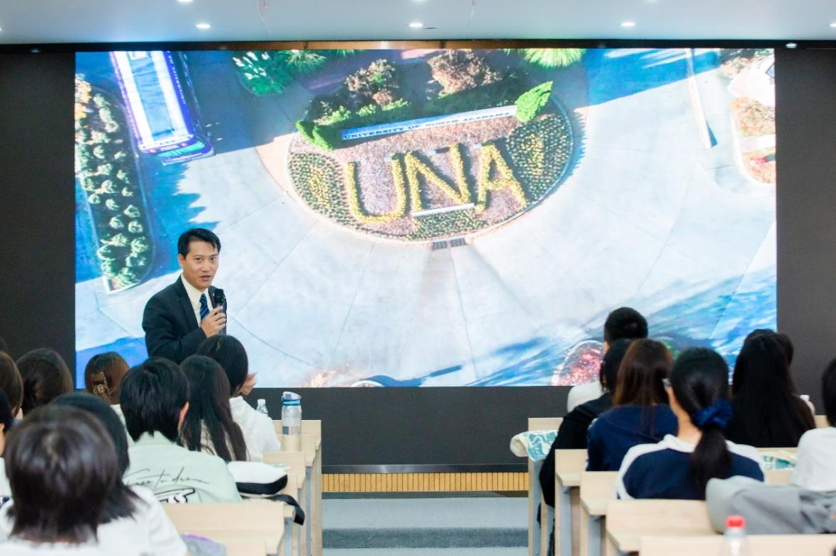 在见面会上,胡珀副校长首先对北阿拉巴马大学进行了介绍,详细讲解了学校的地理位置、历史背景、学术优势以及发展方向。他特别强调,学校高度重视推动教育国际化,是众多国家留学生的心仪院校,学校在提升办学实力和教学质量中,不断为国际学生提供高质量的服务,创建优质的学习环境。希望同学们加强外语学习,做好学业规划,争取到北阿拉巴马大学参加各类交流学习活动,在跨文化、跨国界学习实践中不断完成自我提升。