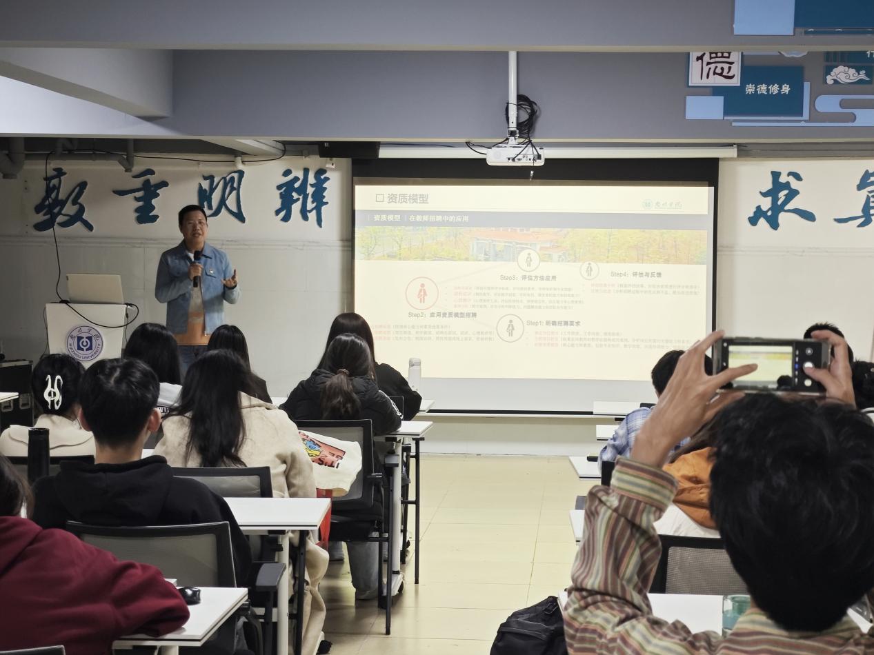 本次师范生面试培训由教育科学学院学生党支部书记袁玉龙主讲,为了区别于以“应试”为核心的传统培训模式,他采取以“赋能”为核心的研究性学习模式,引导学生参与获取知识和应用知识的过程,从而实现解决问题的目标,即掌握面试的原理与技巧。在本次培训中,袁玉龙老师以“资质模型”为理论背景,充分发挥教练角色,指导学生在教师资格面试和教师招考面试情境中,精准辨识“知识”“技能”“经验”“潜力”等考察要素的具体体现,并在面试角色互换中客观剖析自身问题,深入理解面试的深层次逻辑,帮助学生提升认知水平和知识应用能力。
