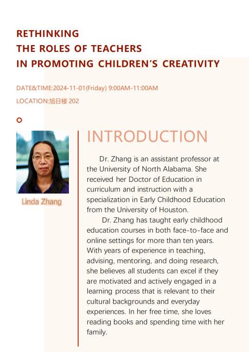 为拓宽学生的国际视野,2024年11月1日上午,来自美国北阿拉巴马大学的Dr. Zhang教授为教育科学学院学前教育专业和小学教育专业的学生们举办了一场主题为“从不同角度激发孩子创造力”的精彩讲座。本次讲座吸引了众多学生参与,旨在引导未来的教师们更好地理解和发掘学生的创造潜能。