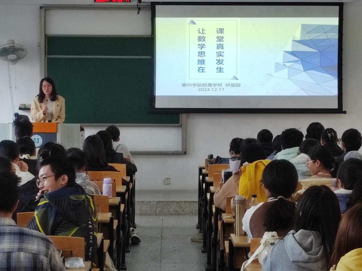 2024年12月17日下午,我院邀请惠州学院附属学校数学科组长林璇璇老师,为2023级小学教育专业的学生作名为“让数学思维在课堂真实发生”的专题讲座。本次活动由惠州学院教务处主办、数学与统计学院承办,讲座由沈威老师主持。