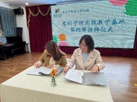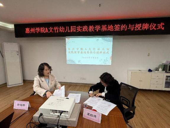 谢桂新副院长详细介绍了惠州学院的发展历程以及教育科学学院的办学理念、专业建设以及师资力量等基本情况,并对惠城区东江学府第三幼儿园、文竹幼儿园对教育科学学院工作的支持表达了诚挚的谢意。两位园长也纷纷表示,德赢vwin8868官网拥有深厚的学术底蕴,期望双方能够实现资源共享、优势互补,最终达成互利共赢、共同进步的目标。紧接着,双方代表正式签署了相关协议,并共同为实践基地揭牌。