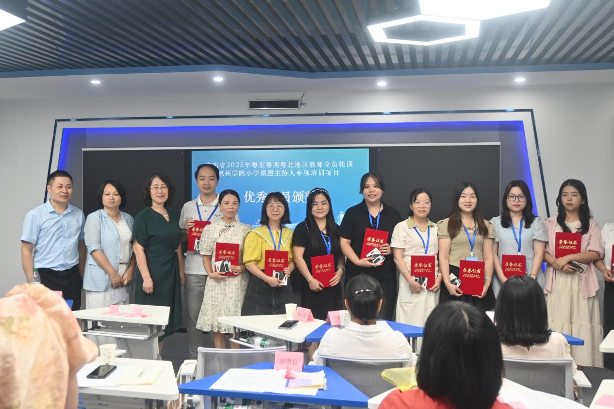 2025年5月29日上午,由广东省教育厅主办、惠州学院承办的2025年粤东粤西粤北地区教师全员轮训“小学课题主持人专项培训”结业典礼在惠州学院旭日科技大楼A座1301室隆重举行。此次专项培训旨在提升粤东粤西粤北地区小学教师的课题研究能力,为区域教育高质量发展赋能。结业典礼由教育科学学院副院长金艳主持,教育科学学院党委书记谢伟强、主持行政工作副院长谢桂新、继续教育学院副院长邓伟浩,项目培训班班主任常攀攀、副班主任卢萌以及全体学员参加了结业仪式。