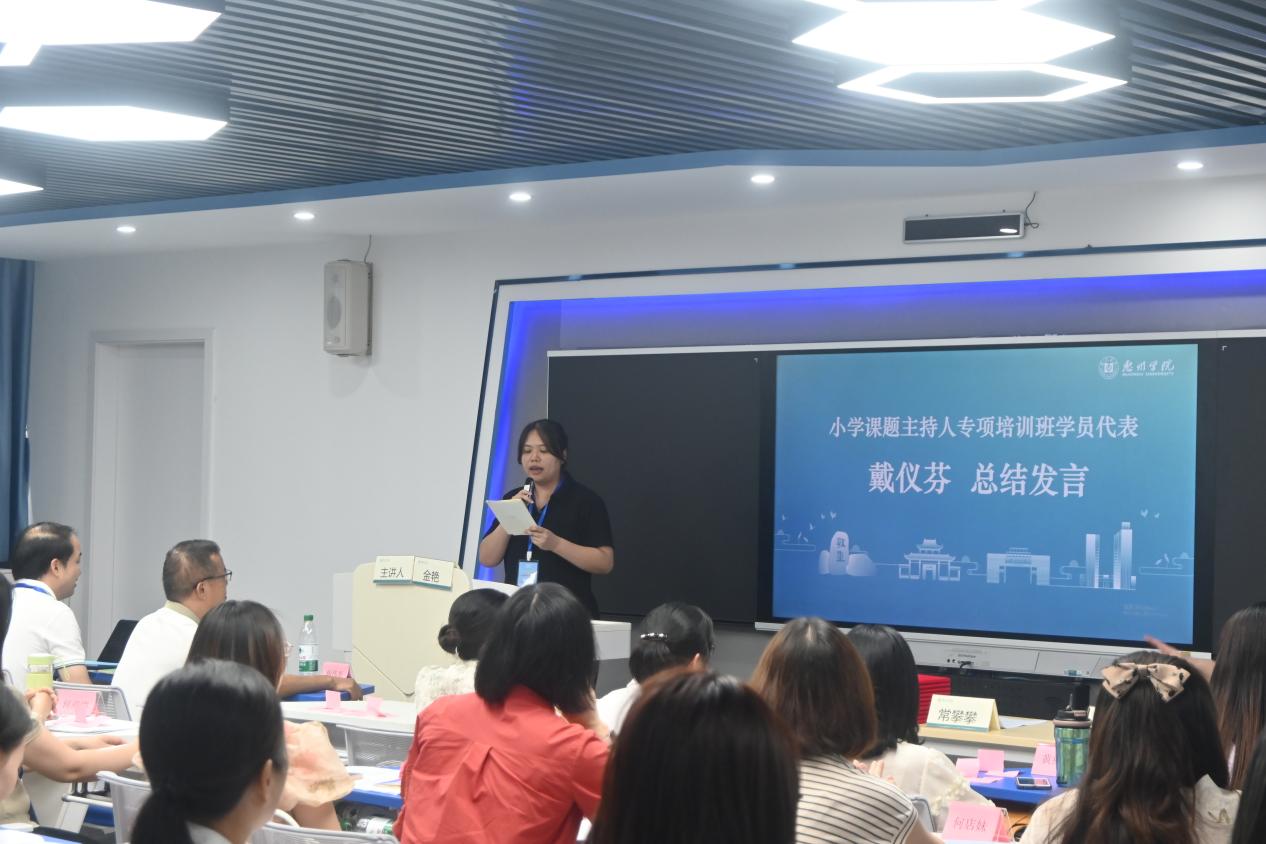 接着,小学课题主持人专项培训班学员代表戴仪芬作总结发言,戴老师深情回顾了本次培训期间的学习收获,表达了对主办方、承办方及授课专家的感谢,并代表全体学员承诺将培训期间的所学所获、所思所想,用于指导自己的教科研,提升教育教学质量,为粤东粤西粤北地区基础教育质量的发展贡献自己的力量。