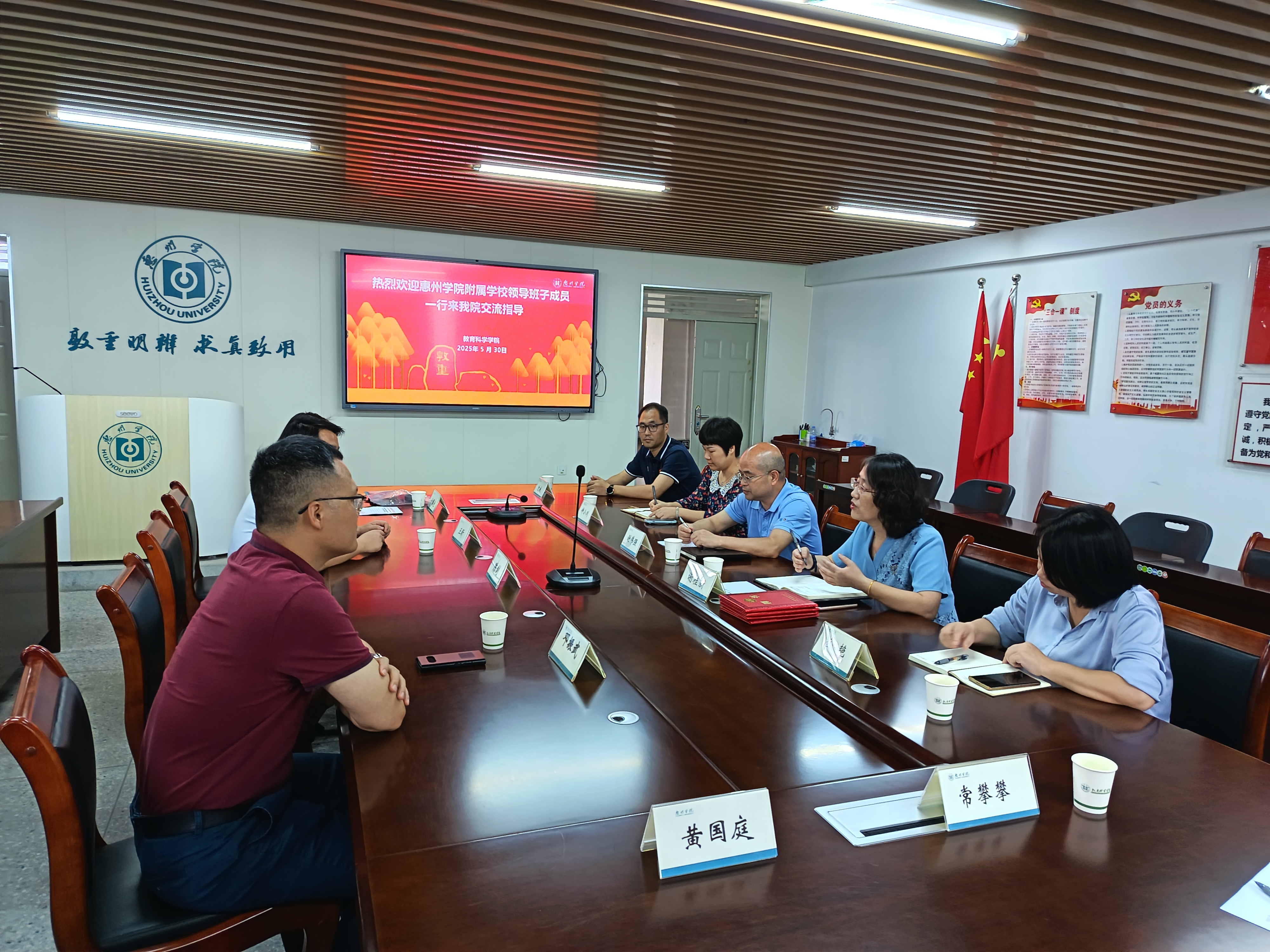 5月30日上午,惠州学院附属学校党支部委员、副校长王昕,副校长邓振武及党务办主任付雅兰一行莅临教育科学学院交流指导。教育科学学院党委书记谢伟强、主持行政工作副院长谢桂新、副院长金艳、党委副书记钟小川、沈威教授以及小学教育系主任常攀攀出席了会议。