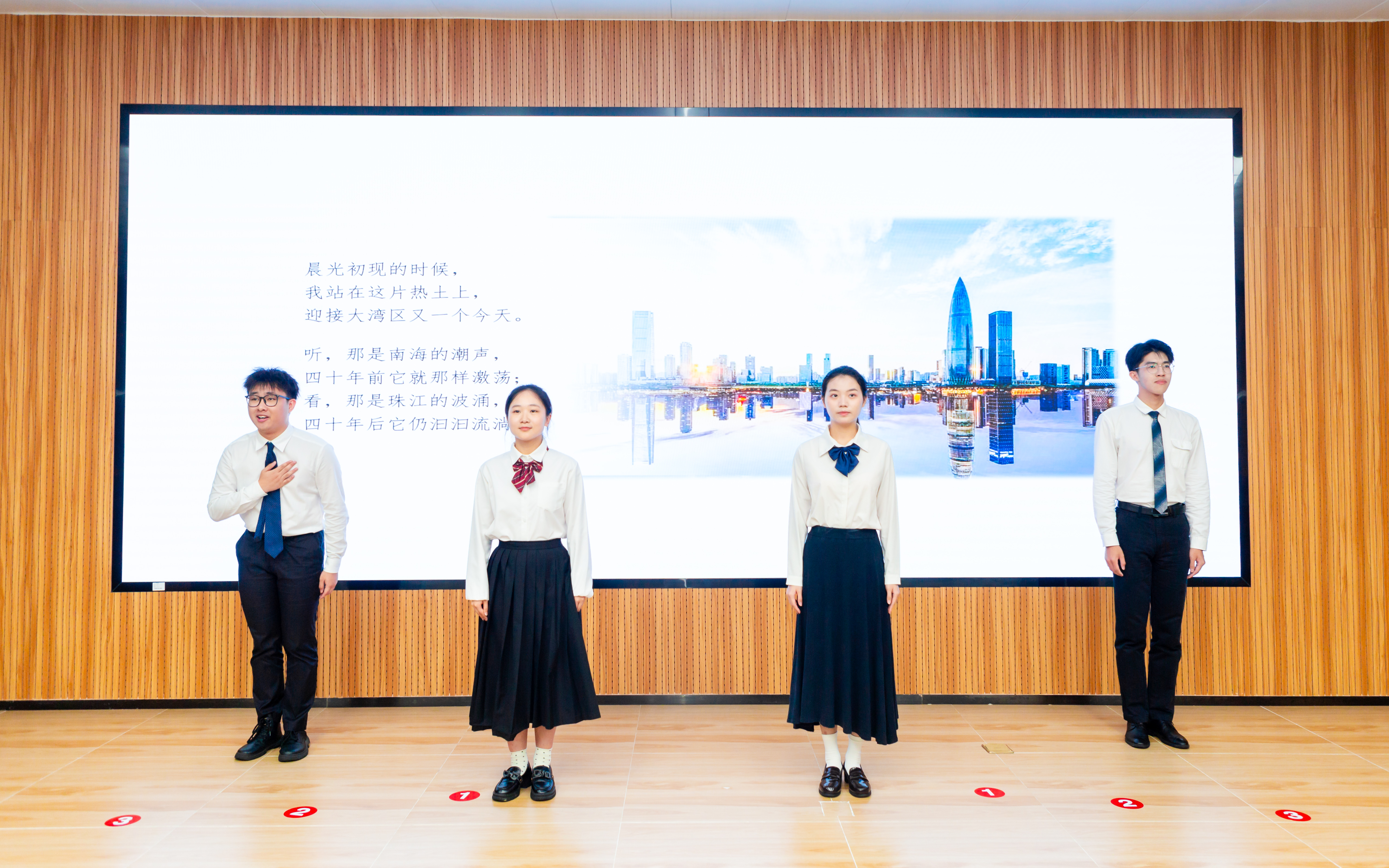 接着,彭文培、李昆儒、邱梓坚、唐雁麒四位同学以深情的朗诵为师兄师姐们献上最美好的祝愿,愿他们在大湾区这片热土,能筑梦远航,大展鸿图。最后,全体师生齐唱校歌,熟悉的旋律唤起美好回忆,也为本次毕业典礼画上了圆满的句号。