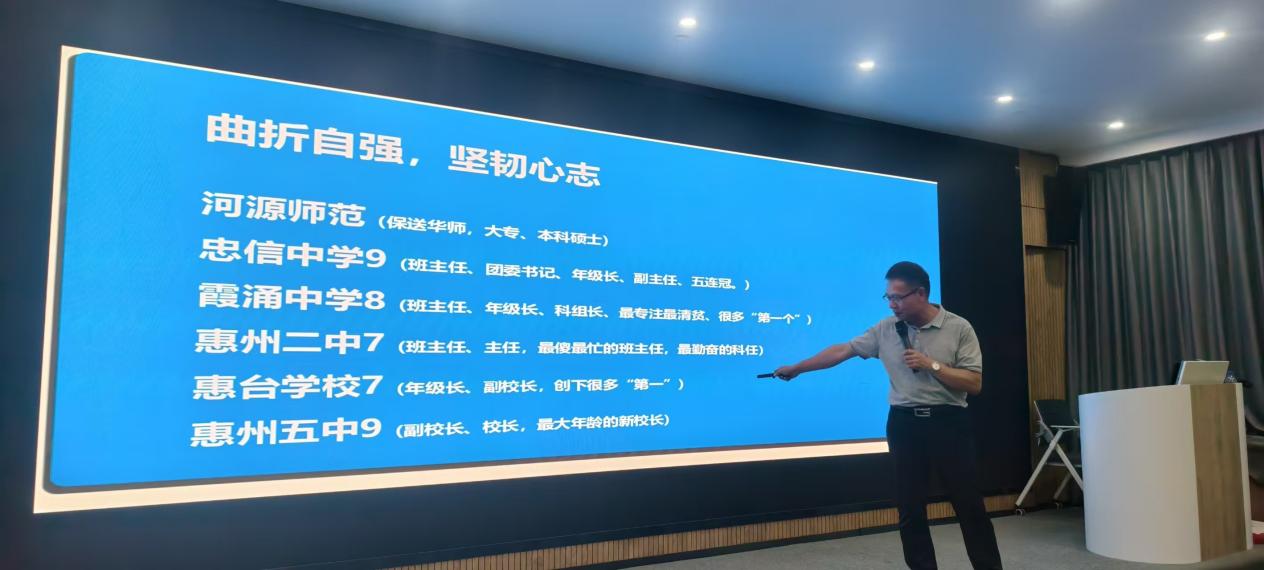 讲座开始,邱炯亮校长向同学们介绍了他从教40多年来一路任职过的学校,从粤北乡区的忠信中学到大亚湾霞涌中学、惠州市第二中学、惠州市惠台学校,再到现在的惠州市第五中学,邱校长的教育履历可谓丰富多彩,并以“曲折自强,坚韧心志”这八个字概括了过往经历,其中蕴含着无数的教育故事与深刻感悟。
