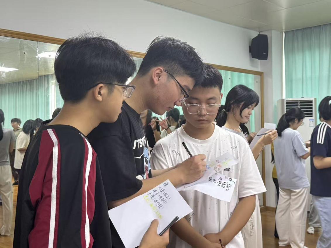 “请多指教”环节,让新生间的了解更进一步。同学们分组制作专属铭牌,在卡片上写下自己的姓名、性格特点、兴趣爱好,以及入学困惑。随后,大家通过自我介绍、互相传阅,遇到有共鸣的“困惑”,便主动写下鼓励的话语;发现相同的兴趣,就兴奋地约定日后一起交流。