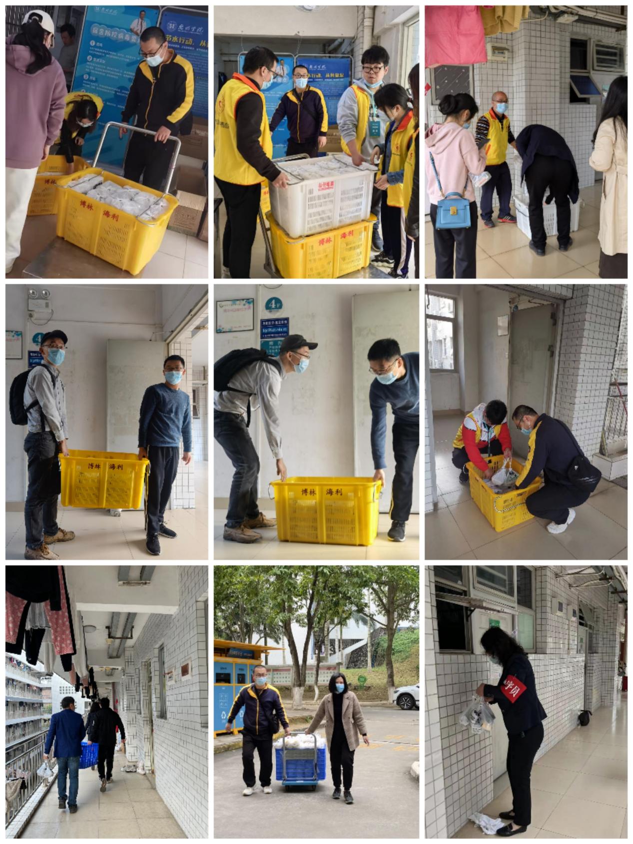 在校园疫情防控这个特殊时期,我院党总支迅速响应、积极组织,通过研判,决定在教工党支部当中组建起一支防疫工作志愿者队伍。胡娇老师也在第一时间安排了疫情防控工作值班表,以协助学校的防疫工作。我院教工党员响应号召,冲锋在前,踊跃投入到校园封控管理志愿服务中,发挥了党组织战斗堡垒和党员先锋模范作用,有序有力推进疫情防控,践行“不忘初心、牢记使命”庄严承诺。在2月27日至3月1日“三天两检”当中,我院有将近二十位教工党员参与到封控宿舍配餐以及师生核酸检测中。在教工党员的影响和带领下,多名入党积极分子和普通教师也积极参与志愿服务。特别是党员教师谢桂新、肖崇好、余中根、王晓平,以及非党员教师黄国庭、李航等,他们每天来得早、效率高、参与学生餐食分配工作次数多,身体力行地协助学校防疫工作,顺利完成了南苑8栋和中苑1栋69个封控宿舍354名学生的餐食配送。很大程度上分担了工作人员的压力与负担,推动了学校“三天两检”工作的顺利开展。