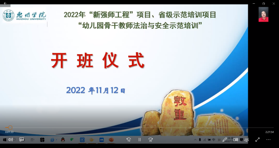 11月12日上午,2022年广东省幼儿园骨干教师法治与安全示范培训班(惠州学院班)在腾讯会议举行开班典礼。贵州师范学院刘晓红副教授、惠州学院教育科学学院党总支书记谢伟强、党总支副书记刘华、学前教育系副主任吴钢、教师张越及幼儿园骨干教师法治与安全示范培训班的全体成员参加了典礼。开班典礼由吴钢博士主持。